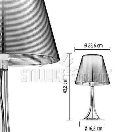 Flos Miss K T lampada da tavolo, Philippe Starck designer. Materiali: corpo in PMMA (polimetacrilato) completamente trasparente stampato ad iniezione con diffusore interno in policarbonato opalino stampato ad iniezione, diffusore esterno in policarbonato trasparente alluminato nero o argento. Regolatore d’intensità istallato sul cavo di alimentazione. Eleganza e raffinatezza rappresentano questa bellissima lampada da tavolo dalla luce diffusa, creata per Flos da Philippe Starck nel 2003. Codice prodotto: F6255000 argento – F6255030 nero.