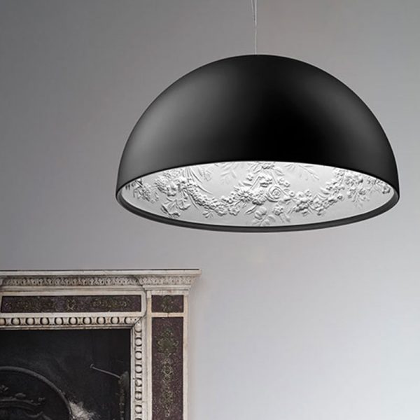 Flos Skygarden 1 lampada a sospensione, Manuel Wanders designer, 2007. Cupola in gesso verniciato di colore bianco all’interno, mentre le finiture cromatiche all’esterno possono essere: ruggine, bianco lucido, oro opaco o nero opaco. Supporto cupola in gesso stampato in lega di alluminio pressofuso. Passacavo superiore e ghiera di bloccaggio regolazione in PC stampato ad iniezione di colore nero. Vite di regolazione in acciaio. Ammortizzatori superiore ed inferiore in Silicone stampato ad iniezione trasparente. Supporto portalampada e fissaggio supporto in PPS. Diffusore in vetro opalino incamiciato soffiato. Ghiera di fissaggio vetro stampata in lega di alluminio pressofuso e finito con cromatatura alodine. Fregio in acciaio inox AISI 304 fotoinciso chimicamente ed imbutito meccanicamente. Attacco a plafone in acciaio stampato e zincato. Rosone in PA6(Nylon).
