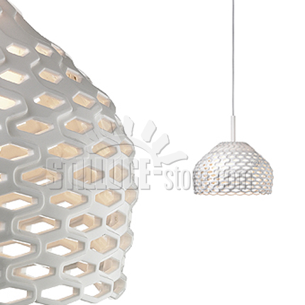 Flos Tatou S2 lampada a sospensione, Patricia Urquiola designer. Lampada a sospensione d. 50 cm. Diffusore interno in policarbonato opale stampato ad iniezione, diffusore esterno in policarbonato. Disponibile nei colori: bianco o grigio ocra. Quattro elementi identici intrecciati tra loro formano una calotta unita, quest’ultima diffonde la luce in modo diretto verso il basso o verso l’alto. Una parte di luce attraversa in modo discreto il diffusore creando un gioco armonico di luci ed ombre attraverso la parte traforata. Utilizza n. 1 lampadina  LED max 21W E27 (esclusa). Disponibile anche nel modello da tavolo e da terra. Perfetta per illuminare il tavolo da pranzo, anche in composizioni multiple.