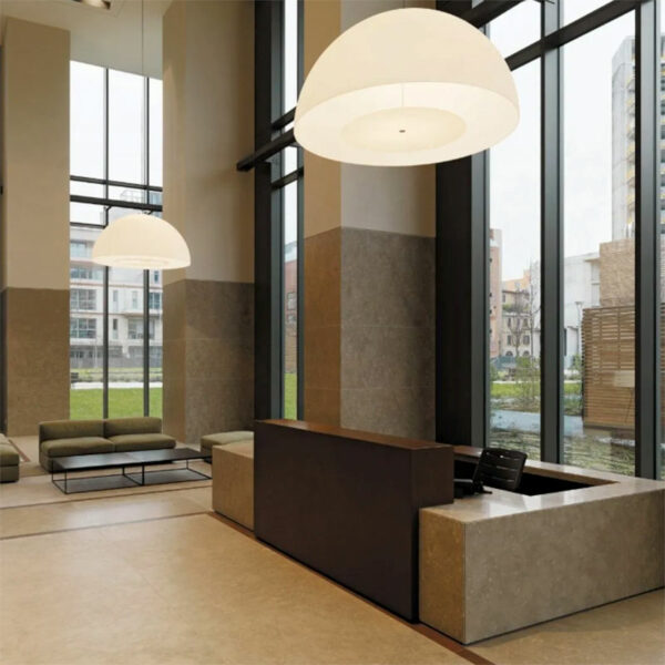 FontanaArte Avico sospensione d. 160 cm. a luce diffusa. Montatura in metallo cromato e diffusore in polietilene nel colore bianco o nero. Lampada di grande impatto scenico visto il grande diametro, separatamente è possibile richiedere un disco di chiusura inferiore per coprire la vista delle lampadine.
