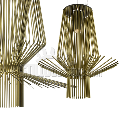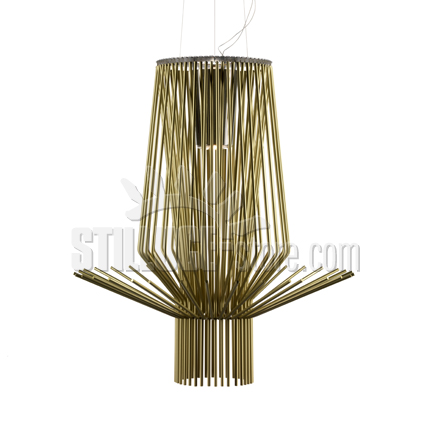 Foscarini Allegretto Assai lampada a sospensione in alluminio verniciato e metallo cromato nel colore oro. Luce riflessa verso il soffitto, diffusa e diretta verso il basso.