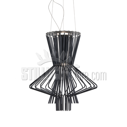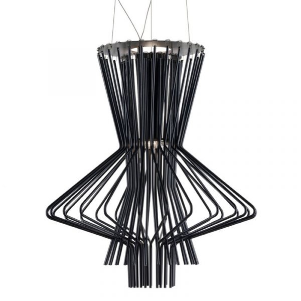 Foscarini Allegretto Ritmico lampada a sospensione, Atelier Oi, 2009. Struttura in alluminio verniciato e diffusore in metallo. Disponibile nel colore nero grafite. La collezione Allegretto riprende la precedente collezione Allegro, riducendo le dimensioni e rendendo questi lampadari adatti alle abitazioni private. La collezione Allegretto si divide in tre diversi modelli, per forma e colore: Allegretto Assai viene proposto nel colore oro, Allegretto Vivace nel colore rame e Allegretto Ritmico nel colore nero grafite. La particolarità di queste sospensione sono le forme divertenti e originali formate con stringhe di metallo assemblate al fine di creare un lampadario dalla luce diffusa e diretta verso il basso e riflessa a soffitto. Codice prodotto 1690171 20.
