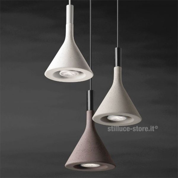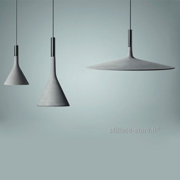 Foscarini Aplomb Mini, lampada a sospensione LED, design di Lucidi e Pevere, 2015. Materiali: alluminio, policarbonato e cemento. Sospensione in cemento proposta in diverse colorazioni che ne esaltano personalità e stile: dal classico grigio del cemento grezzo, che conferisce profondità ai volumi, all’elegante colorazione bianca, a un marrone caldo e intenso, al color antracite. Dopo il modello originario e la versione da terra ora disponibile in una dimensione più piccola. LED GU10 1X8W non incluso, emissione di luce diretta e verso il basso. Codice prodotto: colore bianco 195027R1-10 – colore grigio 195027R1-25 – colore marrone 195027R1-52 – antracite 195027R1 -27.