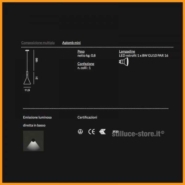 • Dimensioni: ø 11,5 cm. - altezza 20 cm. - altezza totale max 300 cm. - attacco soff. ø 8 cm.
