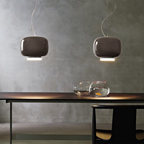 Foscarini Chouchin 3 lampada a sospensione, Ionna Vautrin designer, 2011. Diffusore in vetro soffiato verniciato grigio. Questa nuova famiglia di lampade a sospensione prende il nome dalle tipiche lanterne giapponesi di carta e bambù, utilizzate come leggiadre e luminose insegne fuori dai locali, oppure come portafortuna all’esterno delle abitazioni. La loro forma tradizionale ha ispirato una creazione in puro spirito contemporaneo, realizzata a sua volta in un materiale millenario: il vetro soffiato, verniciato però per renderlo completamente impermeabile alla luce dall’interno e lucido all’esterno, ad eccezione del bordo inferiore, il risultato è una colorazione calda, con un colletto luminoso dal quale si proietta un fascio di luce intenso e diretto verso il basso. La famiglia di Chouchin, collezione di tre sospensioni in vetro soffiato di diverse forme, dimensioni e colori, si compone di 3 modelli, nei quali il colore è parte integrante della forma: arancione la versione grande, grigia la versione piccola e verde quella più allungata, forme e tonalità che accentuano l’individualità dei singoli modelli, ma al tempo stesso sono studiate per essere coordinabili in composizioni multiple. Codice prodotto 210073E-25