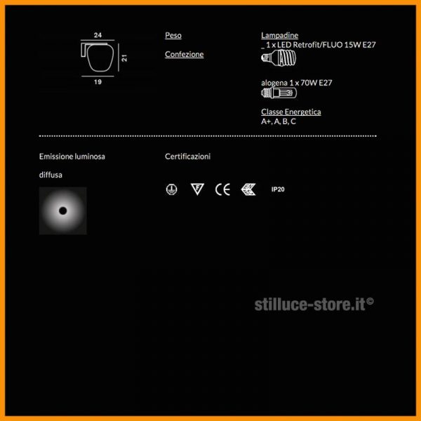 • Lampadina: 220-240V n. 1 Lampadina E27 70W Eco (Resa 100W) o LED max 11W - Esclusa