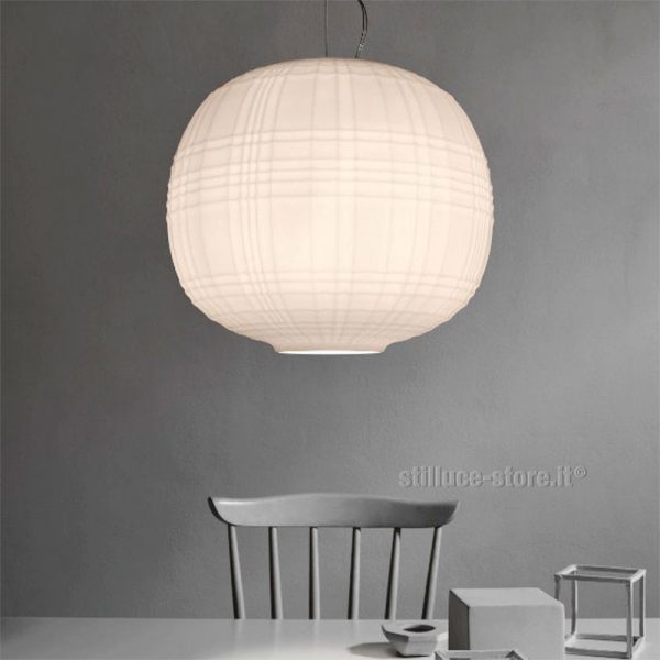 Foscarini Tartan, lampada a sospensione; Ludovica + Roberto Palomba designers. Struttura: vetro soffiato in rilievo e acidato nel colore bianco. Predisposta per una lampadina E27 LED 21W esclusa. Tartan è l’inconfondibile disegno dei tessuti di lana dei kilt scozzesi, un incrocio di linee perpendicolari che genera motivi geometrici sempre diversi. Tartan è realizzata con la tecnica della soffiatura a bocca all’interno di uno stampo con particolari incisioni: il diffusore si arricchisce di linee e pieghe, generando un gioco grafico fatto di luci ed ombre. Codice prodotto: 273007_10 Bianco