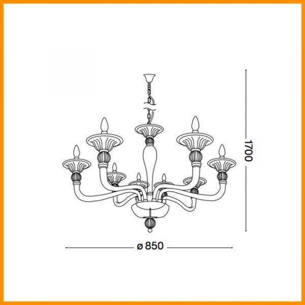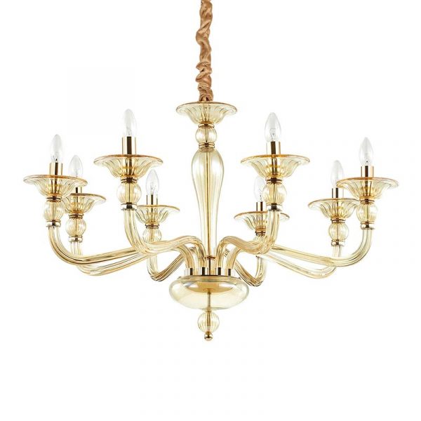 Ideal Lux Danieli sospensione 8 luci; Ideal Lux designer. Sospensione di grandi dimensioni con montatura in metallo cromato con elementi decorativi in vetro soffiato trasparente o con montatura in metallo dorato ed elementi decorativi in vetro soffiato ambra. Copricatena in velluto. Lampadine N. 8 attacco E14 alogena eco 28W o lampadine LED escluse. Codice prodotto: 159980 trasparente – cod. 159973 ambra.