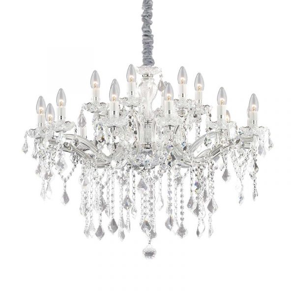 Ideal Lux Florian lampada a sospensione 18 luci, Ideal Lux design. Montatura in metallo con elementi decorativi in vetro, pendagli con ottagoni e gocce finali in cristallo molato. Lampadina: N. 18 alogena eco E14 28W o LED escluse. Lampadario con vetro trasparente e metallo dorato o cromato. Una sospensione dal design classico e ricercato ideale per illuminare e arredare ambienti classici. Florian diventa l’indiscussa protagonista dell’ambiente in cui viene installato. Codice prodotto in base al colore scelto. Codice prodotto: 075150 cromo vetro trasp. – cod. 075181 oro vetro trasp.