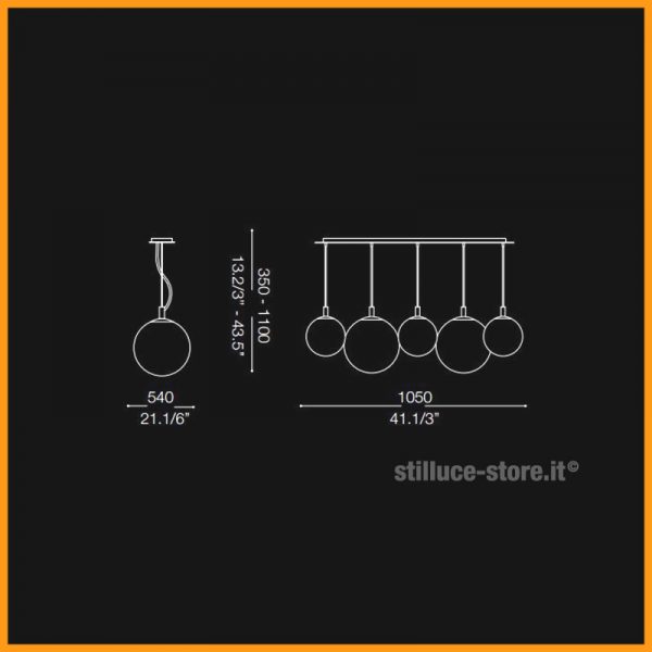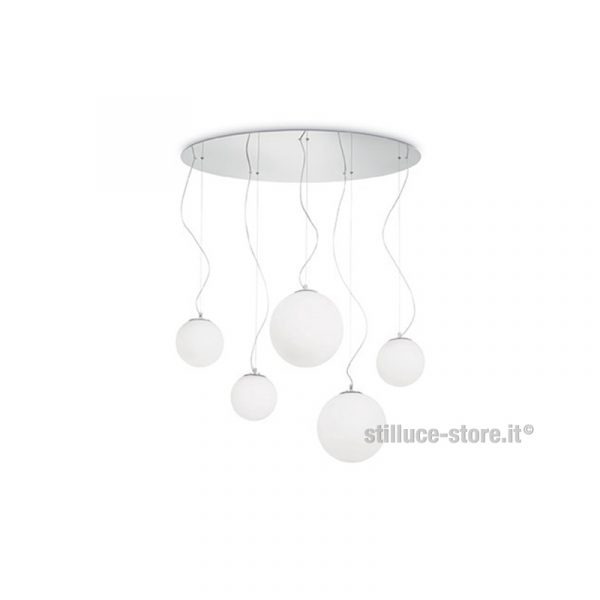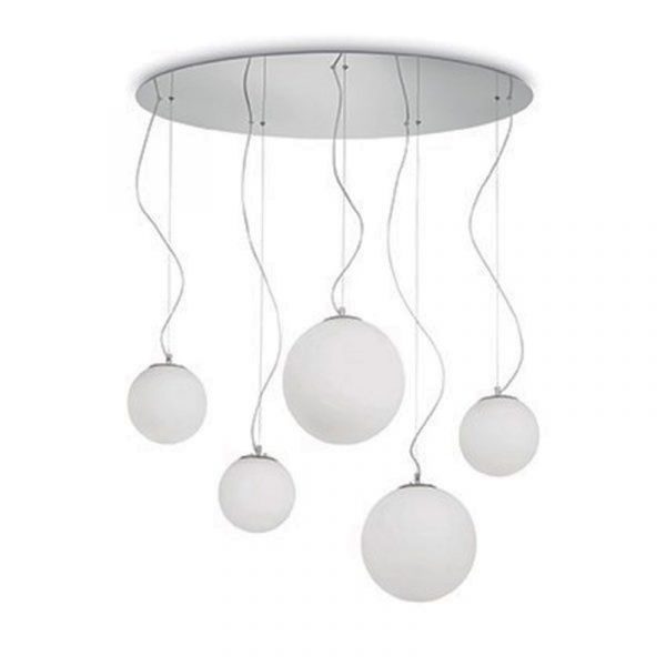 Ideal Lux Mapa lampada a sospensione composta da 5 sfere. Montatura in metallo cromato con diffusore a sfera in vetro bianco soffiato e acidato con cavi in acciaio a lunghezza regolabile. Una sospensione importante, le sfere sono sfalsate in altezza e dimensione. Mapa Bianco crea un suggestivo effetto; ideale per il soggiorno posizionata sul tavolo da pranzo. Utilizza n. 5 lampadine alogene eco o LED attacco E27 max 60W (escluse). Codice prodotto: 043562