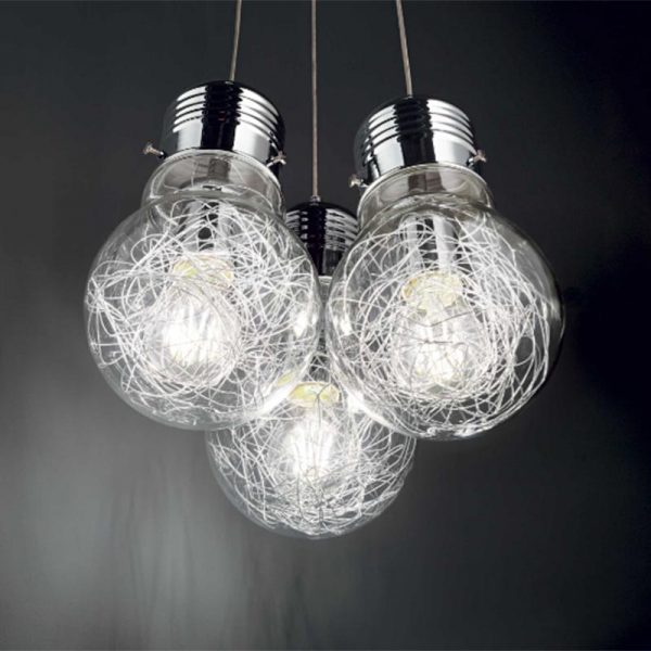 Ideal Lux Luce Max lampada a sospensione a tre luci. Montatura in cromo, diffusore in vetro soffiato con decorazione interna in filo di alluminio. Sospensione con cavo in acciaio a lunghezza regolabile, una lampada originale e divertente caratterizzata da un intreccio di fili all’interno del diffusore in vetro. Ottima per illuminazione ambienti medio-grandi. Una sospensione a grappolo perfetta per essere posizionata ad un centro tavolo. Codice prodotto: 081762