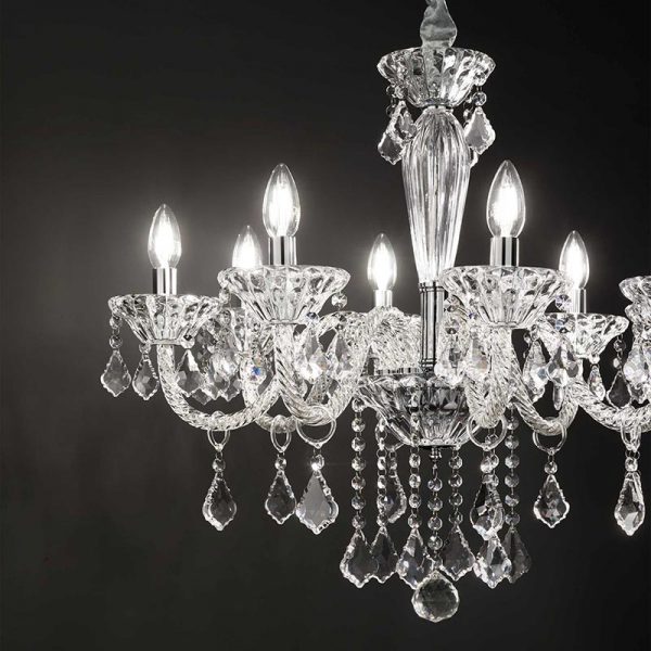 Ideal Lux Tiepolo sospensione 8 luci; Ideal Lux designer. Sospensione in vetro soffiato trasparente lavorato a mano con dettagli in metallo cromato. Pendagli con ottagoni e gocce in cristallo molato, copricatena in velluto. Lampadine alogene eco o LED (escluse). Una sospensione adatta per il soggiorno, la camera da letto con arredamento sia classico che moderno. Codice prodotto: 034720