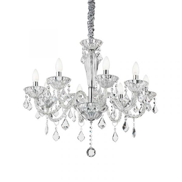 Ideal Lux Tiepolo sospensione 8 luci in vetro soffiato trasparente, pendagli con ottagoni e gocce in cristallo molato, particolari in metallo cromato.