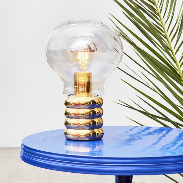 Ingo Maurer Bulb Brass lampada da tavolo con base di ottone lucidato a specchio di alta qualità (realizzata artigianalmente) e diffusore in vetro soffiato in cristallo di Murano. Lampadina LED a cupola argentata inclusa.