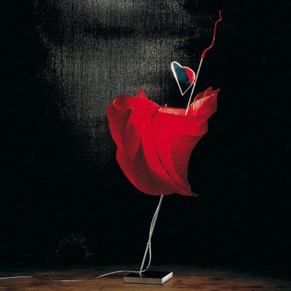 Ingo Maurer Kokoro lampada da tavolo, Dagmar Mombach, Ingo Maurer und team 1998. Diffusore in carta rossa, metallo, acciaio inossidabile, vetro, materiale sintetico. Specchio orientabile. Interruttore dimmer. Lunghezza cavo 250cm. Kokoro fa parte della collezione “The MaMo Nouchies” insieme ad altri prodotti come Gaku, Poul Poul, Won-Tu-Bu e Samurai. Codice prodotto: 2997000