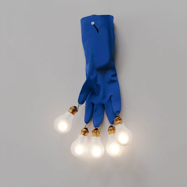 Ingo Maurer Luzy On The Wall lampada da parete, Ingo Maurer 2018. Materiali: plastica, metallo. Guanti blu con lampadina smerigliata sulla punta delle dita. Sorprendente e non convenzionale, controversa, senza pregiudizi e lontano dalla noia del design comune. Anche quanto questi prototipi diventeranno oggetti di uso quotidiano, continueranno a sorprendere per la loro forma e il loro colore saranno sempre un incoraggiamento a pensare in modo libero da vincoli. Trasformatore integrato, dimmerabile (dimmer non incluso), con interruttore a levetta e spina, lunghezza cavo 300 cm. Disponibile anche nel modello a sospensione. Codice prodotto: 1048200