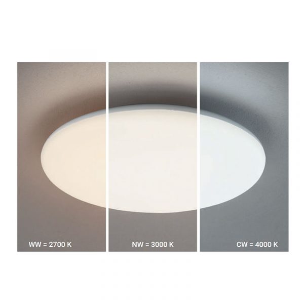 LineaLight Swithc lampada a LED da parete o soffitto d. 30 cm, grado di protezione IP54. Montatura in materiale plastico e diffusore in polietilene lineare bianco. La lampada è dotata di un selettore manuale per il controllo della temperatura (2700K/3000K/4000K).