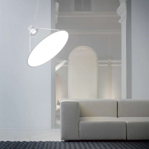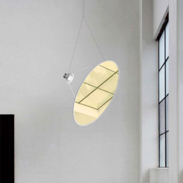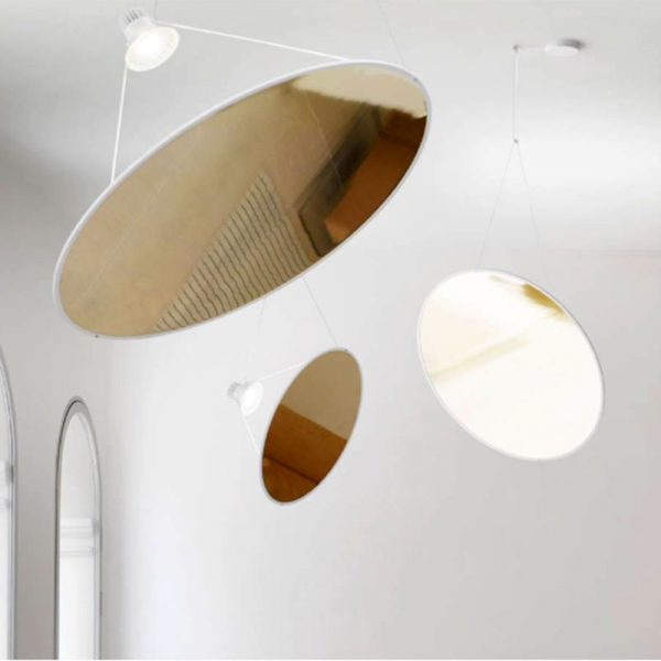 Luceplan Amisol lampada a sospensione LED con disco d. 75 cm. nel colore bianco opalino, argento, oro. Modificando i punti di collegamento e la lunghezza dei fili la rotazione del disco può essere impostata in qualsiasi angolazione.