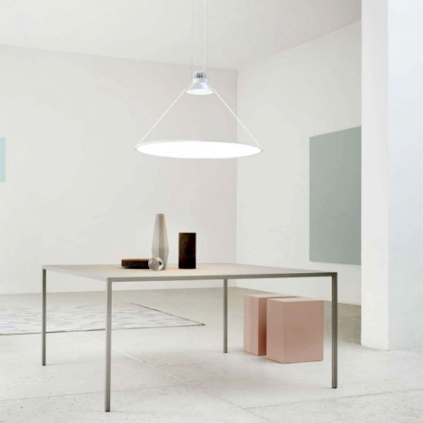 Luceplan Amisol 75 lampada a sospensione LED; di Daniel Ribakken designer. Struttura in alluminio nel colore grigio chiaro, disco / riflettore diffusore d. 75 cm. in materiale plastico nel colore bianco opalino, argento, oro. LED 53W 220/240V 50/60Hz 3000K incluso. Sospensione dimmerabile push/DALI, cavo lunghezza max mt. 3. Amisol occupa un ampio spazio fisico con un volume ridotto al minimo e orientabile nello spazio; una potente fonte luminosa proietta un fascio di luce sul grande leggerissimo disco, riflettendo e diffondendo la luce. I due elementi principali sono collegati tramite delle sottilissime aste. Modificando i punti di collegamento dei due fili e la lunghezza la rotazione del disco può essere impostata in qualsiasi angolazione. Codice prodotto: D91
