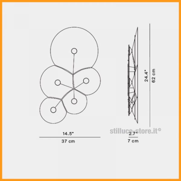 Luceplan Bulbullia lampada da parete A5, Francisco Gomez Paz designer. Bulbullia è composta da una serie di parabole di varie dimensioni che s’intersecano generando la caratteristica geometria delle bolle di sapone. Forme coniche, ampie e piatte, ognuna delle quali è costituita da una sagoma in policarbonato bianco che, piegandosi leggermente, assume una natura strutturale. La sorgente LED è posizionata all’interno di ciascuna bolla che riflettendosi verso l’interno del cono, crea un effetto unico sprigionando una luce morbida e gradevole. Codice prodotto: D95A5