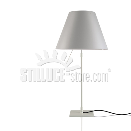 Luceplan Costanza lampada da tavolo; Paolo Rizzatto designer. Materiali: struttura in alluminio, paralume in policarbonato serigrafato nei nuovi colori: verde alchimia, rosa mistico, bianco nebbia, cipria, nocciola, rosso primario, nero liquirizia, blu petrolio, giallo vivo, grigio cemento e bianco. Il paralume intercambiabile di policarbonato diffonde una luce calda e gradevole ed è sostenuto dalla struttura in alluminio su due soli punti di appoggio. Se urtato, oscilla senza cadere. Il profilo sottile della lampada, ma strutturalmente solido, si inserisce benissimo in ogni ambiente. Il dimmer sensoriale ad astina regola l’accensione e lo spegnimento passando per quattro livelli di intensità luminosa. Lo stelo telescopico consente di controllare l’altezza della lampada. Codice prodotto:1D13