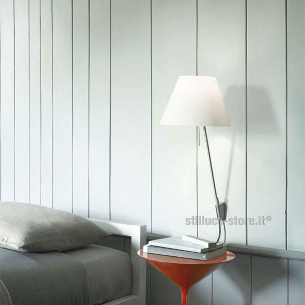 Luceplan Costanzina lampada a parete, Paolo Rizzatto designer. Corpo in alluminio nel colore nero con paralume intercambiabile in policarbonato bianco o colorato. Mezzo tono: verde alchimia, rosa mistico, bianco nebbia, cipria, nocciola, Radieuse: rosso primario, nero liquirizia, blu petrolio, giallo vivo, grigio cemento. Lampadina E14 42W eco (42W = 60W) o LED – esclusa. Lampada a parete coordinata con i modelli da tavolo, sospensione e terra. Leggera ed essenziale, si inserisce con naturalezza in ogni ambiente senza porre vincoli stilistici di accostamento. Il paralume leggero e lavabile, appoggiato su due punti d’equilibrio diffonde una luce calda e piacevole ed illumina con personalità l’ambiente. L’interruttore ad astina vicino alla sorgente luminosa comanda l’accensione. Per leggere, studiare, conversare, scrivere, riposare, meditare. Codice prodotto: d13a.pi.