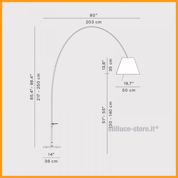 • Dimensioni: struttura H.217 / 250 cm. paralume Ø 50 cm. h 35 cm base 36 x 36 cm.