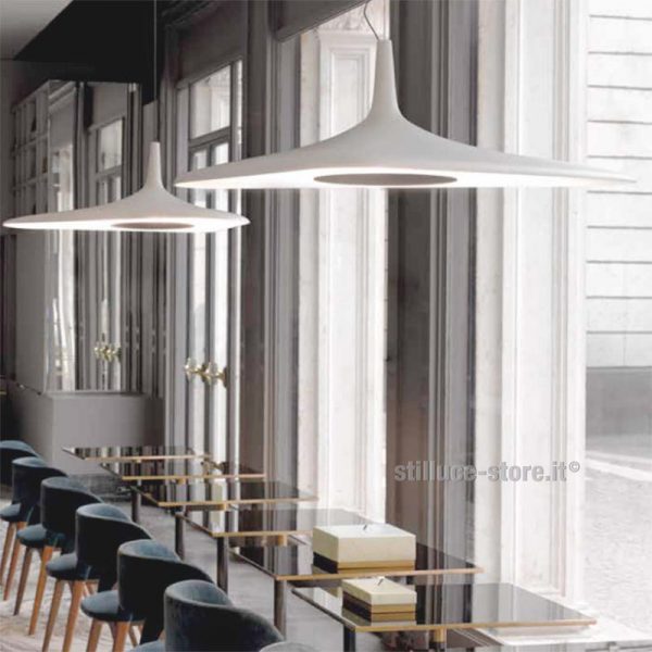 Luceplan Soleil Noir lampada a sospensione a LED dalla forma futuristica e tecnologica, disponibile nel colore bianco o nero. Luce diffusa indiretta e omogenea adatta ad illuminare sia ambienti domestici che lavorativi.