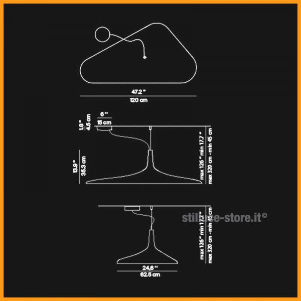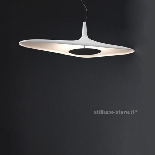 Luceplan Soleil Noir lampada a sospensione a LED, Odile Decq, 2015. Struttura in poliuretano espanso stampato. LED 35W 3000K 3800lm incluso. Tecnologica e futuristica, la nuova sospensione di Luceplan presenta un sistema ottico all’avanguardia in grado di diffondere una luce diffusa indiretta e omogenea. Una forma irregolare e snella che mantiene il suo equilibrio baricentrico grazie agli spessori del corpo, pur restando sospesa grazie ad un solo cavo asimmetrico, la sorgente led è nascosta all’interno di un disco. Soleil Noir è presentata in due colorazioni: bianco o nero. Una sospensione che sfida le leggi della statica e permette un design ed una luminosità al limite del possibile. Disponibile anche nella versione a soffitto. Codice prodotto: D89s.