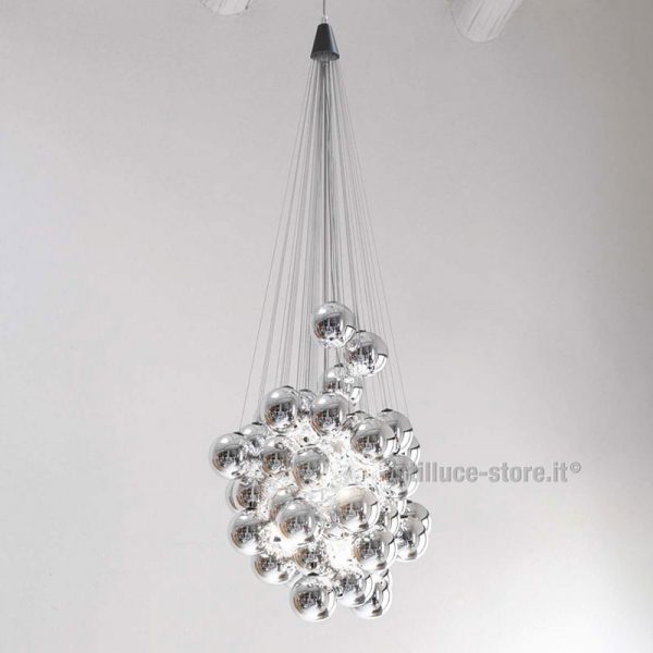 Luceplan Stochastic sospensione a led composta da 48 sfere in vetro soffiato con finitura mirror, non ha una forma predefinita ma è componibile dall’utente a seconda della propria creatività. Lampade da design a kmzero – in offerta. SOLO N. 1 ARTICOLO!