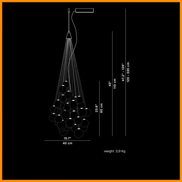 Luceplan Stochastic sospensione a led con 48 sfere; Daniel Rybakken designer. Materiali: astine in acciaio, n. 48 sfere in vetro soffiato diametro 8,7 cm. finitura mirror. Rivisitazione di una tipologia classica in chiave moderna, il vetro soffiato garantisce preziosità ed eleganza. Stochastic è componibile dall’utente, non ha una forma predefinita, la lampada consente svariate combinazioni, ogni sfera è collegata a delle astine in acciaio contraddistinte da tre differenti lunghezze che vanno poi agganciate al plafone secondo la propria creatività, dando vita ad un grappolo di luce ogni volta diverso. La sorgente luminosa a led mid power 26W – 2380lm 3000K è collocata e nascosta al centro del grappolo. Luce è indiretta e soffusa che si dirige sia verso l’alto che il basso. Articolo esposto in ShowRoom. Il prodotto è originale e garantito da StilluceStore, potrebbe non venire consegnato nel suo imballo ma comunque in imballo idoneo al trasporto. DISPONIBILITA’ N. 1 SOSPENSIONE SFERE MIRROR.