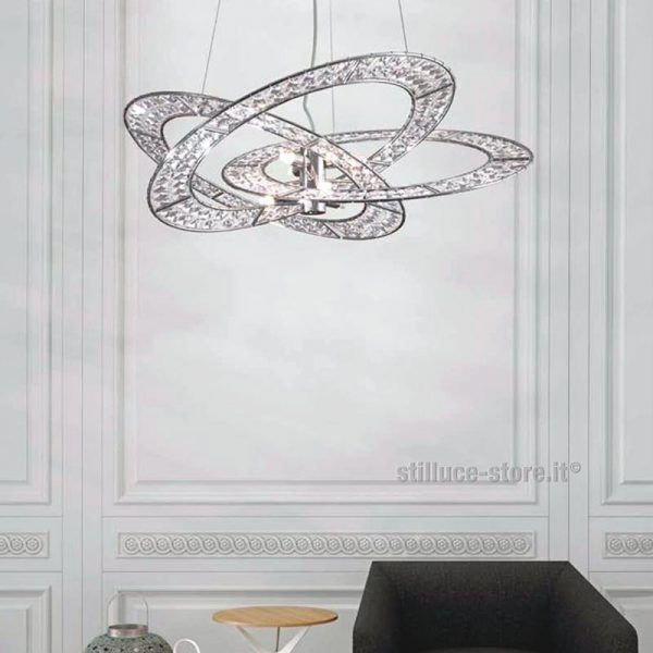Marchetti Trilogy lampada a sospensione d. 95 cm, Marchetti Design. Struttura cromo con cristalli quadrati. Predisposta per n. 9 lampadine attacco G-9 alogena eco max 48W o LED – escluse. La particolarità della lampada sono i tre anelli ed i tanti cristalli molati dalla forma quadrata che rendo la sospensione molto elegante, adatta ad illuminare la zona living ma anche la camera da letto, perfetta in ogni contesto d’arredamento, sia classico che moderno. Codice prodotto 055.313.04