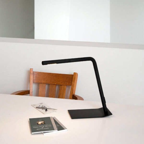 Martinelli Luce Colibrì lampada tavolo con struttura in alluminio anodizzato nero, testa orientabile, snodata e girevole, touch dimmer. Sorgente di luce a LED integrato.