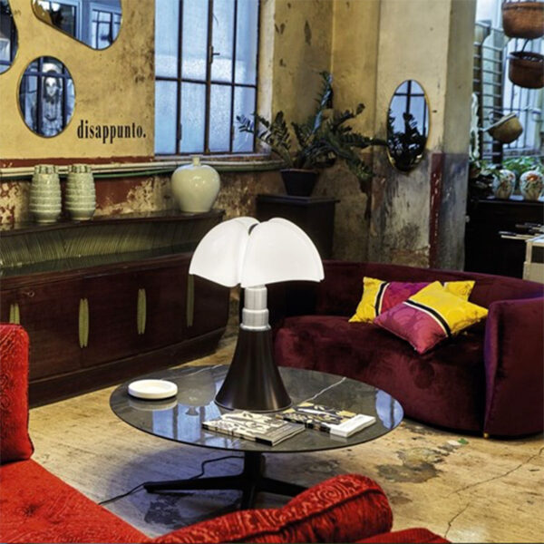 Martinelli Luce Pipistrello lampada tavolo; design Gae Aulenti, 1965. Lampada da tavolo o da terra regolabile in altezza (h. 70 – 86 cm) a luce diffusa. Telescopio in acciaio inox satinato con diffusore in metacrilato opal bianco, LED integrato. Alimentatore a spina, dimmerazione con interruttore. Finiture di colore: marrone, bianco, nero lucido, verde agave, ottone satinato. La lampada è realizzata con tecniche di stampaggio del diffusore in metacrilato molto innovative per l’epoca in cui è stata progettata. La forma conica della base si sviluppa verso l’alto allargandosi nelle nervature del diffusore come lo spiegarsi delle ali di un pipistrello. Pipistrello resiste al tempo con un fascino unico grazie alla sua eleganza, modernità e molteplici colori. Codice: 620-DIM-L-1