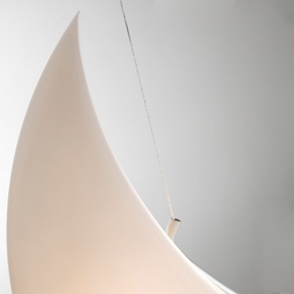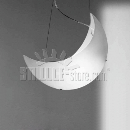 Mazzega 1946 Luna (Moon) lampada a sospensione, design Michele De Lucchi. Diffusore in vetro soffiato incamiciato con il lattimo, molato a mano, satinato. Struttura in metallo verniciato grigio chiaro. Colore diffusore bianco satinato. Una sospensione pensata anche per le camerette dei bambini, facendoli sognare grazie all’atmosfera magica e surreale creata dalla luce morbida che Moon diffonde. Codice prodotto: MOOSOMBG