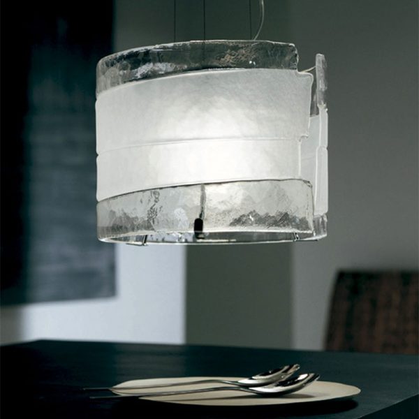 Mazzega1946 (Riflessi) Radius lampada a sospensione D. 31 cm, M M design. Diffusore in vetro lavorato a mano con finitura satinata. Struttura in metallo cromato lucido. La caratteristica di Riflessi sta nel diffusore; quest’ultimo presenta diverse fasce, le fasce centrali sono cristallo satinato mentre le fasce esterne possono essere cristallo trasparente, ambra o rosso. Grazie allo stile ricercato è possibile posizionare questa collezione sia in ambienti classici che moderni. Codice prodotto RADSOMMD