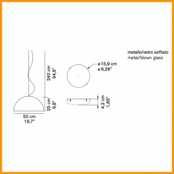 Oluce Sonora 411 sospensione d. 50 a luce diretta e diffusa; Design Vico Magistretti, 1976. Sospensione in vetro soffiato di Murano opale acidato, rosone bianco e cavo trasparente. Una forma geometrica pura, perseguita da Magistretti per tutta la vita, costante compagna di strada è per lui la geometria. Sonora, declinata in numerosi materiali e dimensioni è uno degli emblemi di questo percorso creativo, rimasta nel corso degli anni una delle lampade più amate.