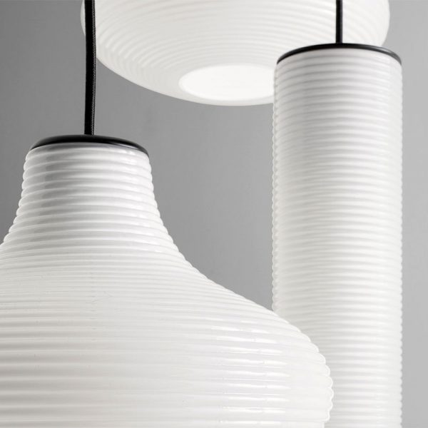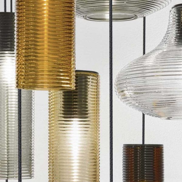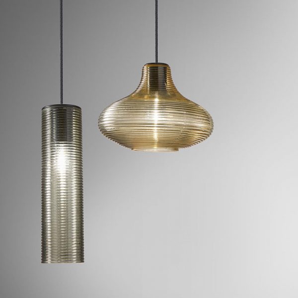 Panzeri Clio sospensione d. 8,5 cm completa di rosone; Silvia Poma designer. Materiale: vetro soffiato cavo e rosone in metallo colore nero. Sospensione in vetro soffiato a fermo, finitura particolare a coste disponibile nei colori: bianco, cristallo trasparente, acciaio, ambra, bronzo, verde e tabacco. Cavo elettrico in tessuto nero con possibilità di personalizzarne la lunghezza. Clio ha una emissione di luce diffusa perfetta per il soggiorno, singola per una penisola, un tavolino; è completa di lampadina attacco E27 LED filamento a vista potenza 8W 2700K 1050lm.