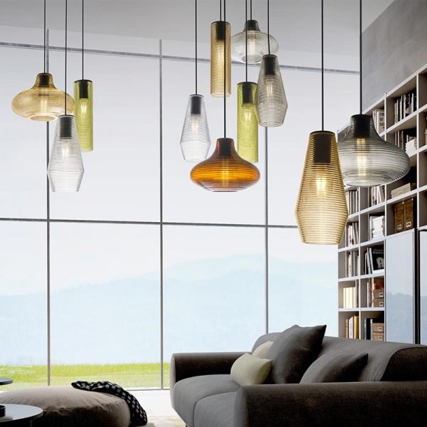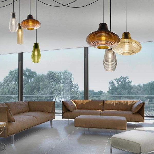 Panzeri Olivia sospensione d. 13 cm completa di rosone; Silvia Poma designer. Materiale: vetro soffiato e rosone in metallo. Sospensione in vetro soffiato a fermo, finitura particolare a coste disponibile nei colori: bianco, cristallo trasparente, acciaio, ambra, bronzo, verde e tabacco. Rosone in metallo colore nero, cavo elettrico in tessuto nero con possibilità di personalizzarne la lunghezza. Olivia ha una emissione di luce diffusa perfetta per il tavolo da pranzo. Completa di lampadina attacco E27 LED filamento a vista potenza 8W 2700K 1050lm. Codice prodotto: L097