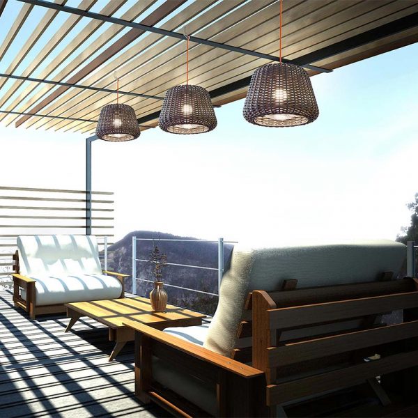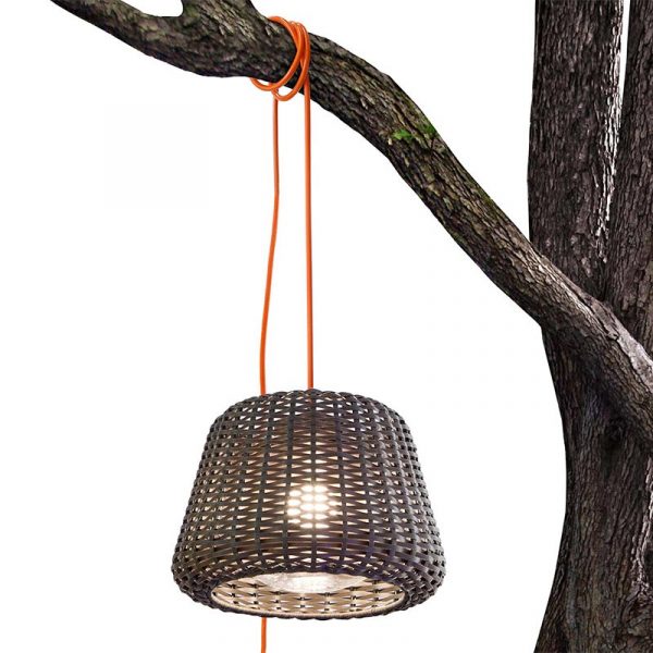 Panzeri Ralph lampada a sospensione da esterno / interno d. 50 cm. Team Design 2011. Paralume in rattan sintetico intrecciato a mano; sfera in policarbonato con portalampada E27 per lampadina LED, basso consumo o alogena ECO. Paralume disponibile nel colore marrone. Cavo di alimentazione nel colore arancione. Nella confezione è incluso 4,5 mt. cavo, spina, rosone, o-ring silicone IP65 e moschettone. Il diffusore è con attacco a baionetta, studiato per permettere una facile rimozione per l’eventuale ritiro durante l’inverno. Lampade installate con rosone grado IP20 (interno), installate con O-Ring, spina e moschettone grado IP65 (esterno). Ideale per zone living esterne ed interne.