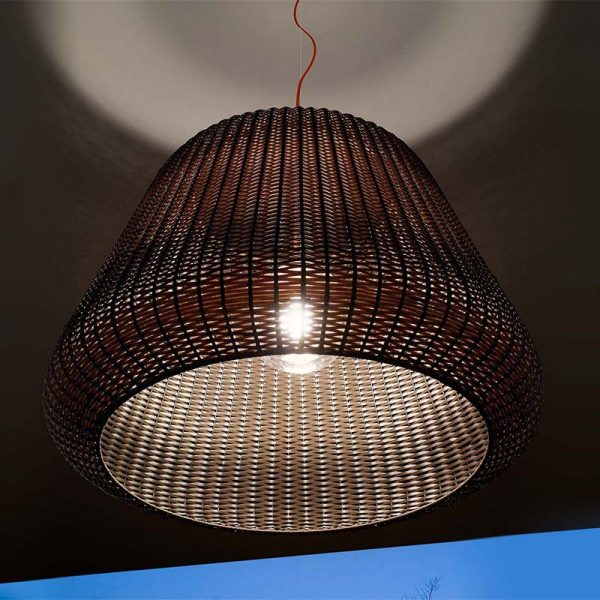 Panzeri Ralph lampada a sospensione da esterno / interno d. 90 cm. Team Design 2011. Paralume in rattan sintetico intrecciato a mano; sfera in policarbonato con portalampada E27 per lampadina LED, basso consumo o alogena ECO. Paralume disponibile nel colore marrone. Cavo di alimentazione nel colore arancione. Nella confezione è incluso 4,5 mt. cavo, spina, rosone, equipaggiata anche con un cavo di sospensione in acciaio. Il diffusore è con attacco a baionetta, studiato per permettere una facile rimozione per l’eventuale ritiro durante l’inverno. Lampade installate con rosone grado IP20 (interno), installata con spina grado IP65 (esterno). Ideale per zone living esterne ed interne, il portico, un grande terrazzo.