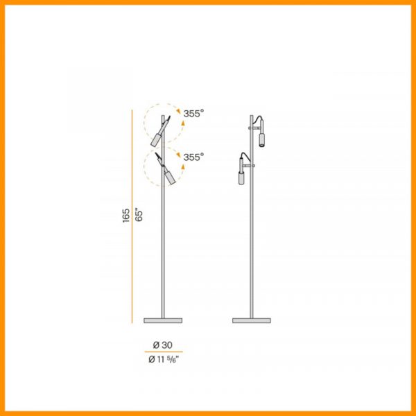 Panzeri Tubino lampada da terra LED; Matteo Thun Designer. Lampada per interni con fascio luminoso orientabile. Base di appoggio in lamiera decapata, stelo in tubo di acciaio, snodi in ottone, teste orientabili in alluminio con diffusori in policarbonato sagomato con finitura opalina. Cavi di connessione tra le teste e lo stelo in PVC trasparente. Cavo di alimentazione in PVC trasparente lunghezza 2,5 mt. con interruttore e spina. I due faretti Tubino sono orientabili a 355°, led integrato 2 x6,5W 2700K incluso. Colore lampada: bianco o nero satinato.