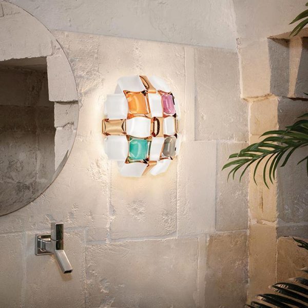Slamp Mida lampada da parete ispirata al mondo dell’alta gioielleria. Diffusore realizzato completamente a mano, con attacco magnetico per facilitare l’installazione e la pulizia. Colori disponibili: white-platinum, white-gold, amber e multicolor.