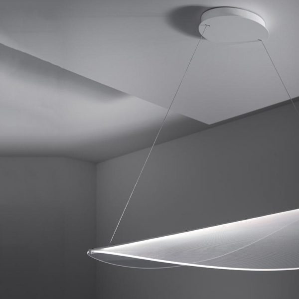 Stilnovo Diphy 76 lampada a sospensione LED; Mirco Crosatto designer. Sospensione con diffusore in PMMA trasparente termocurvato, microinciso al laser con tecnologia Opti-Light che permette a Diphy di scomparire alla vista se spenta e riapparire magicamente da accesa. Struttura centrale in alluminio verniciato bianco con sorgente topLED dimmerabile (acquistando KIT0026 – escluso) con elevato confort visivo, coprifilo in metallo verniciato bianco con cavi di sostegno/conduttori in acciaio. Diphy è una collezione di petali luminosi e trasparenti completa: sospensioni in diverse dimensioni, lampada da terra e parete /soffitto. La sorgente centrale trasmette la luce ai bordi sinuosi e alle microincisioni delle superfici creando un’illuminazione morbida e omogenea.