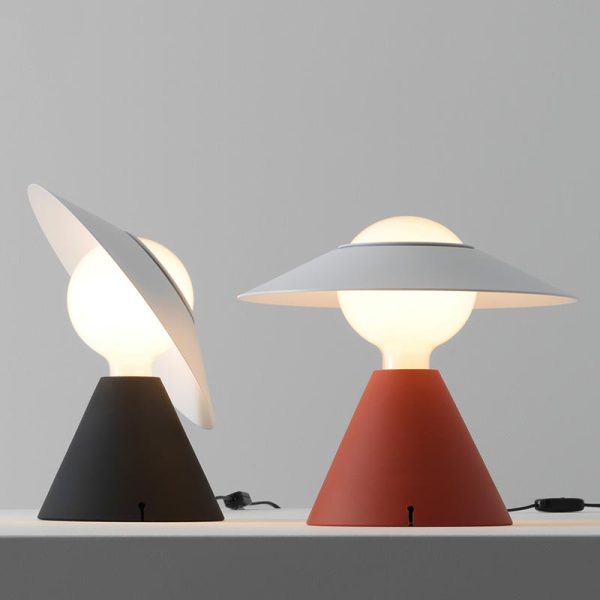 Stilnovo Fante lampada da tavolo; Jonathan De Pas, Donato D’Urbino, Paolo Lomazzi designer – 1978. La base di Fante è di forma conica in silicone leggera e piacevole al tatto, nei colori rosso mattone o nero, il disco orientabile in alluminio verniciato è di colore bianco. Lampadina LED a globo 11W 2700K luce calda E27 – inclusa. Grazie al riflettore sulla testa della lampadina è possibile orientare la luce controllando sia la luce sul piano di appoggio che la leggera diffusa indiretta verso l’alto.