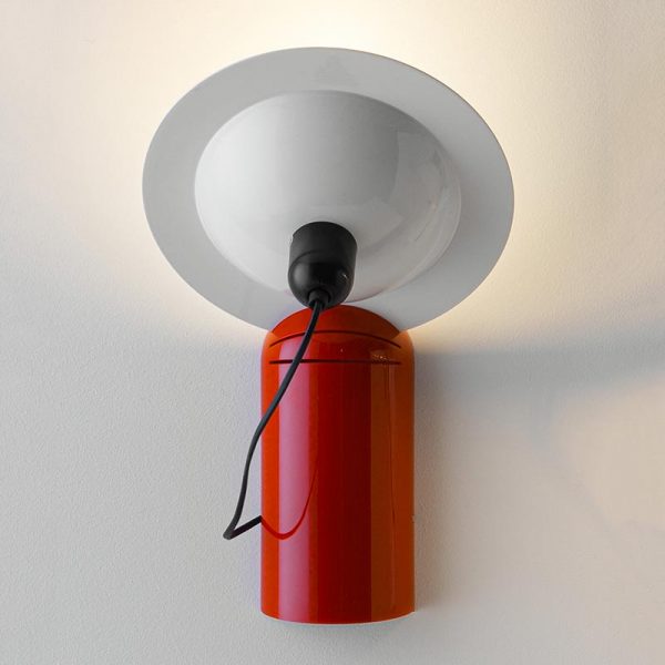 Stilnovo Lampiatta lampada da parete; Jonathan De Pas, Donato D’Urbino, Paolo Lomazzi designer – 1971. Lampada con corpo in materiale plastico, parabola in alluminio, base removibile in acciaio. Finiture di colore: bianco, nero o rosso con parabola verniciata nel colore bianco. Lampadina a cupola argentata LED 7W 2700K (luce calda) attacco E27 inclusa. Il paralume di Lampiatta è pensato per potersi inserire in una delle quattro fessure del basamento, consentendo l’orientamento e l’inclinazione della luce a piacere.