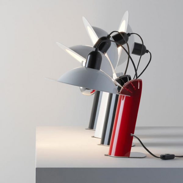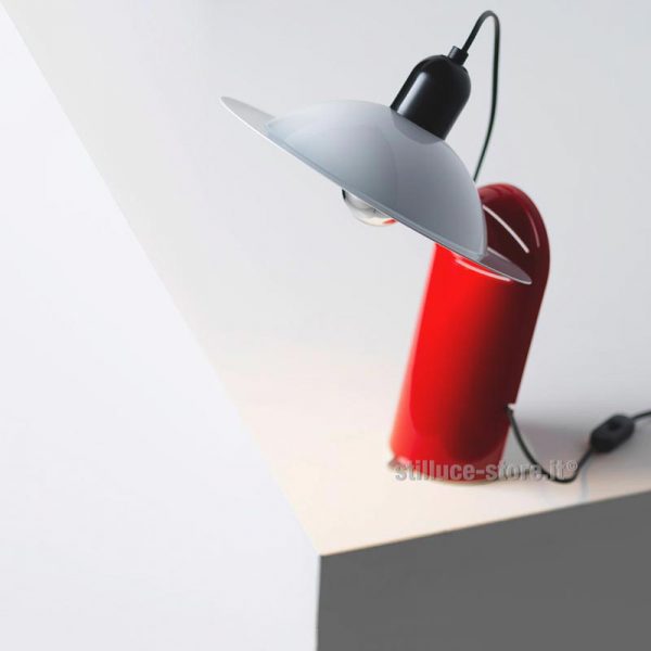 Stilnovo Lampiatta lampada da tavolo; Jonathan De Pas, Donato D’Urbino, Paolo Lomazzi designer – 1971. Lampada con corpo in policarbonato in pasta lucido nel colore nero, bianco o rosso. Base in metallo removibile (per eventuale installazione a parete), parabola in alluminio verniciato nel colore bianco. Lampadina a cupola argentata LED 7W 2700K (luce calda) attacco E27 inclusa. Il paralume di Lampiatta è pensato per potersi inserire in una delle quattro fessure della base, consentendo l’orientamento e l’inclinazione a piacere.