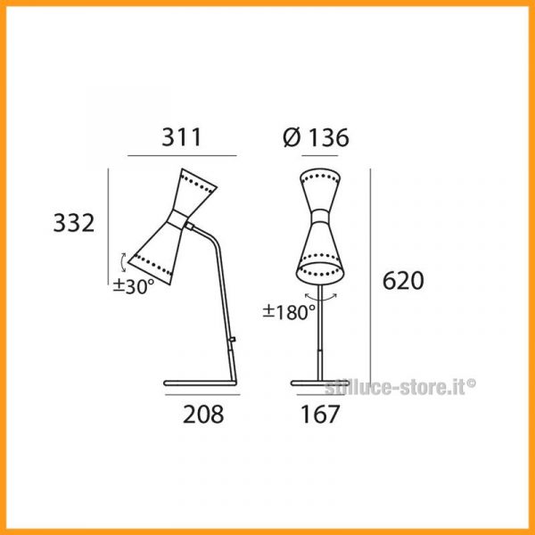 Stilnovo Megafono lampada da tavolo; Stilnovo design – 1958. Base in metallo nero, corpo lampada in ottone con doratura galvanica, doppio paralume in metallo verniciato lucido nel colore avorio o nero. N. 2 lampadine LED 6W 2700K luce calda attacco E14 incluse. Megafono è una vera icona degli anni 50, il paralume orientabile a doppio cono crea una luce diretta e indiretta. Le due finiture, avorio e nero abbinate al prezioso stelo in ottone donano a questa serie di lampade un tocco raffinato.