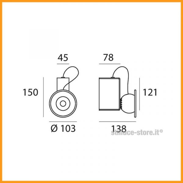 Stilnovo Minibox lampada da parete LED; Gae Aulenti, Piero Castiglioni designer – 1981. Il modello a parete è composto da un corpo in metallo verniciato nelle finiture di colore: bianco lucido, nero, caffè, rosso e verde. Occhio luminoso con un aggancio magnetico che permette di orientare la luce LED.