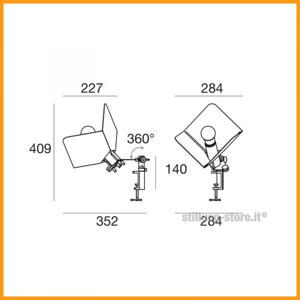 Stilnovo Triedro lampada a morsetto in metallo sagomato e piegato in tre parti nel colore bianco, riflette la luce senza abbagliare. Un doppio snodo portante garantisce flessibilità nei movimenti e permette la rotazione e l’inclinazione della sorgente LED in qualsiasi posizione, il morsetto si fissa facilmente.